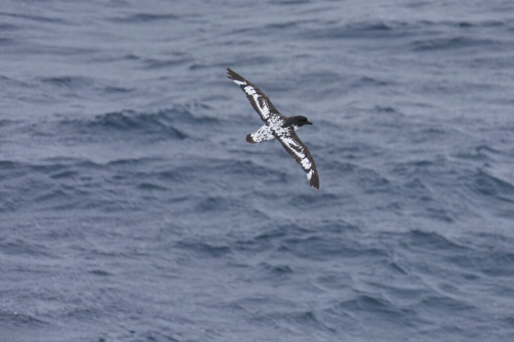 Throughout the day, we spotted our first Wilson’s storm petrels (also called Jesus birds because they appear to walk on water) and Cape Petrels (also called the pintado petrel, ‘pintado’ meaning ‘painted’ in Spanish – referring to the checkered upper parts and wings). We also saw lots of southern fulmars, blue petrels, Antarctic prions, some black-browed albatross, grey-headed albatross, light-mantled albatross, and more! It was also an exciting day for marine mammal sightings, mostly starting when we crossed above the continental shelf. Some lucky survey groups saw humpback whales, fin whales, an Antarctic fur seal, and even killer whales! Those of us who hadn’t seen any whales all day on survey were graced with a few humpback whales surfacing outside the window while we were eating dinner (Ellie’s first whale sighting ever!), and some more while we reviewed the day’s photos in the lounge after dinner.